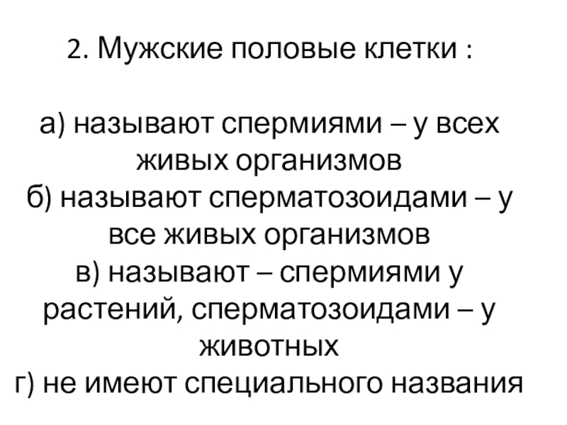 2. Мужские половые клетки : а) называют спермиями – у всех живых организмов б) называют сперматозоидами – у все живых организмов в) называют – спермиями у растений, сперматозоидами – у животных г) не имеют специального
