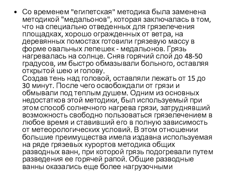 том, что на специально отведенных для грязелечения площадках, хорошо огражденных от ветра, на деревянных помостах готовили грязевую массу в форме овальных лепешек - медальонов. Грязь нагревалась на солнце. Сняв горячий слой до 48-50 градусов, им быстро обмазывали больного, оставляя открытой шею и голову.