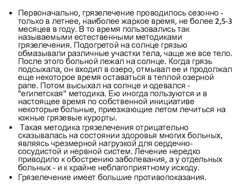 Слайд 9Первоначально, грязелечение проводилось сезонно - только в летнее, наиболее жаркое время,