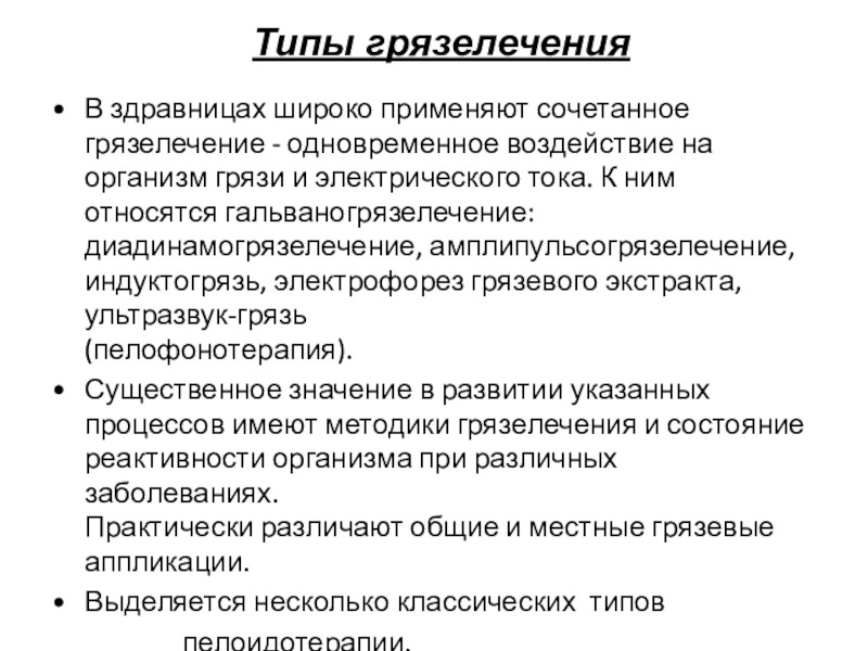 грязи и электрического тока. К ним относятся гальваногрязелечение: диадинамогрязелечение, амплипульсогрязелечение, индуктогрязь, электрофорез грязевого экстракта, ультразвук-грязь
