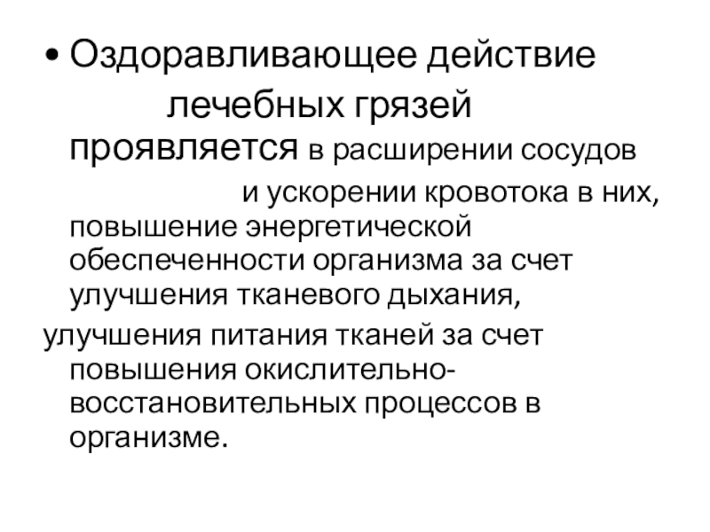 рассасывающим действием. При правильном проведении грязелечебные процедуры оказывают также благоприятное воздействие, повышая общий тонус и реактивность организма .