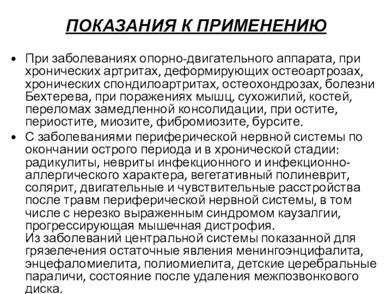 С заболеваниями периферической нервной системы по окончании острого периода и в хронической стадии: радикулиты, невриты инфекционного и инфекционно-аллергического характера, вегетативный полиневрит, солярит, двигательные и чувствительные расстройства после травм периферической нервной системы, в том числе с нерезко выраженным синдромом каузалгии, прогрессирующая мышечная дистрофия.