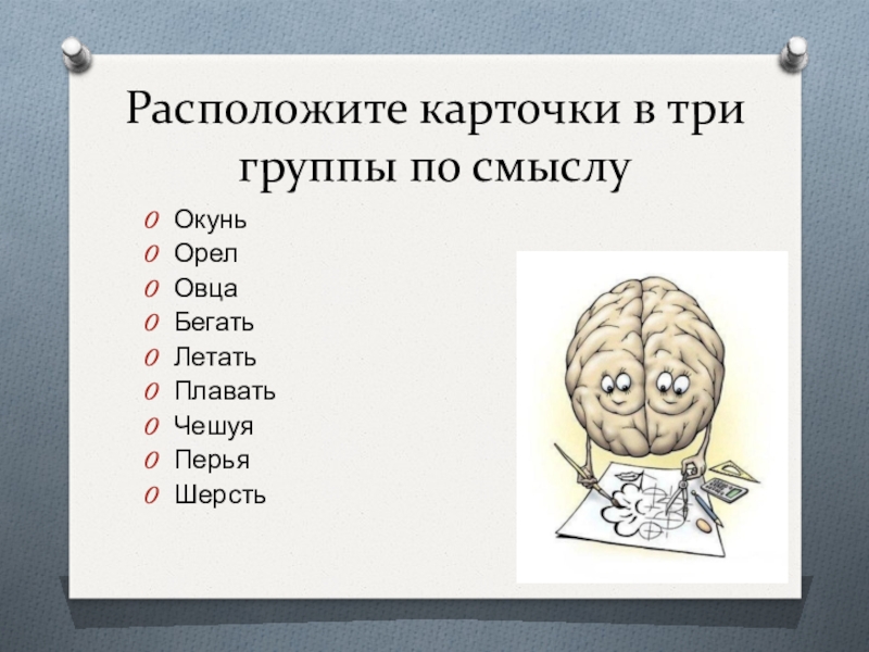 Расположите карточки в три группы по смыслуОкуньОрелОвцаБегатьЛетатьПлаватьЧешуяПерьяШерсть