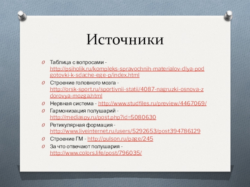 Источники Таблица с вопросами - http://psiholik.ru/kompleks-spravochnih-materialov-dlya-podgotovki-k-sdache-ege-p/index.htmlСтроение головного мозга - http://orsk-sport.ru/sportivnii-statii/4087-nagruzki-osnova-zdorovya-mozga.htmlНервная система - http://www.studfiles.ru/preview/4467069/Гармонизация полушарий - http://mediaspy.ru/post.php?id=5080630Ретикулярная формация