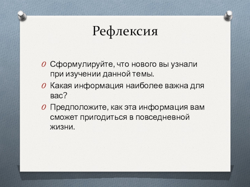 Рефлексия Сформулируйте, что нового вы узнали при изучении данной темы.Какая информация наиболее важна для вас? Предположите, как