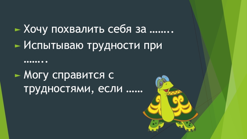 Хочу похвалить себя за ……..Испытываю трудности при ……..Могу справится с трудностями, если ……
