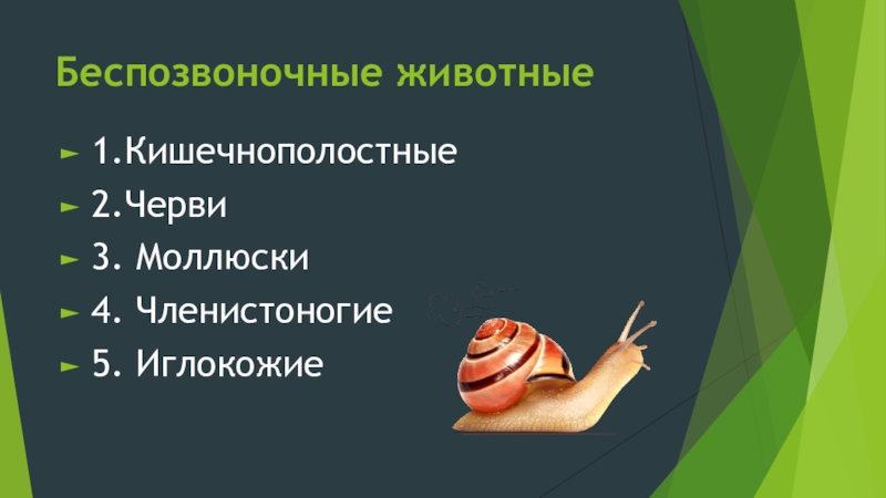 Беспозвоночные животные1.Кишечнополостные2.Черви3. Моллюски4. Членистоногие5. Иглокожие