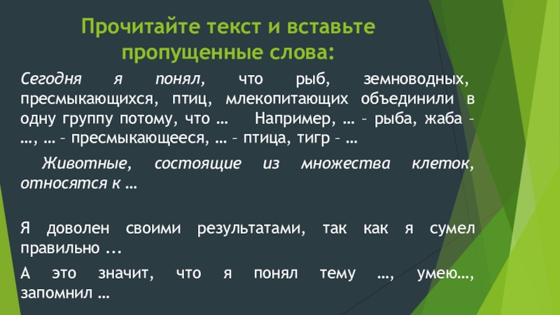 Прочитайте текст и вставьте пропущенные слова:Сегодня я понял, что рыб, земноводных, пресмыкающихся, птиц, млекопитающих объединили в одну