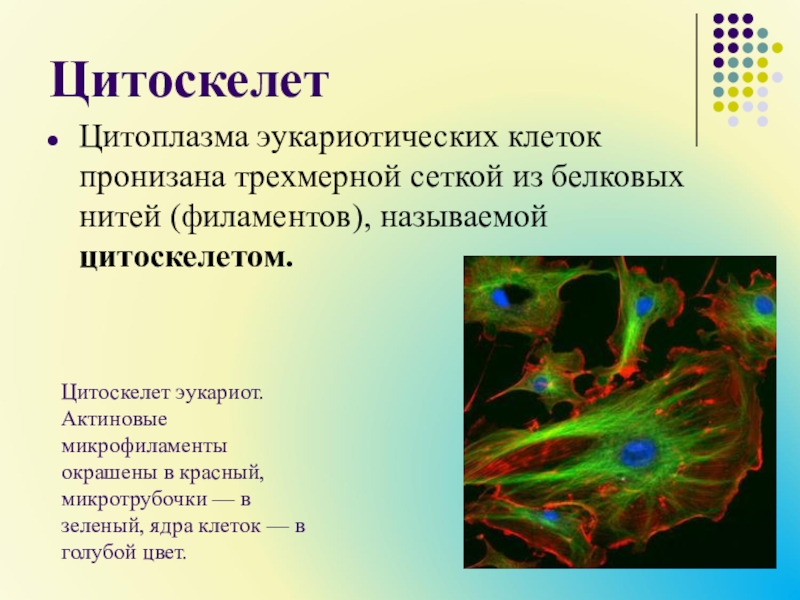 Цитоскелет эукариот. Актиновые микрофиламенты окрашены в красный, микротрубочки — в зеленый, ядра клеток — в голубой цвет.