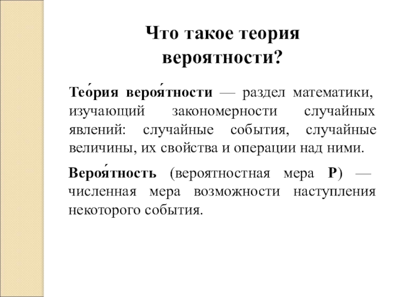 Вероя́тность (вероятностная мера Р) — численная мера возможности наступления некоторого события.