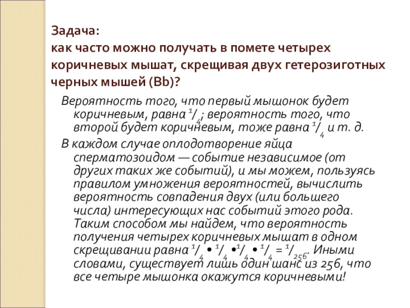 В каждом случае оплодотворение яйца сперматозоидом — событие независимое (от других таких же событий), и мы можем, пользуясь правилом умножения вероятностей, вычислить вероятность совпадения двух (или большего числа) интересующих нас событий этого рода. Таким способом мы найдем, что вероятность получения четырех коричневых мышат в одном скрещивании равна 1/4 • 1/4 •1/4 • 1/4 = 1/256. Иными словами, существует лишь один шанс из 256, что все четыре мышонка окажутся коричневыми!