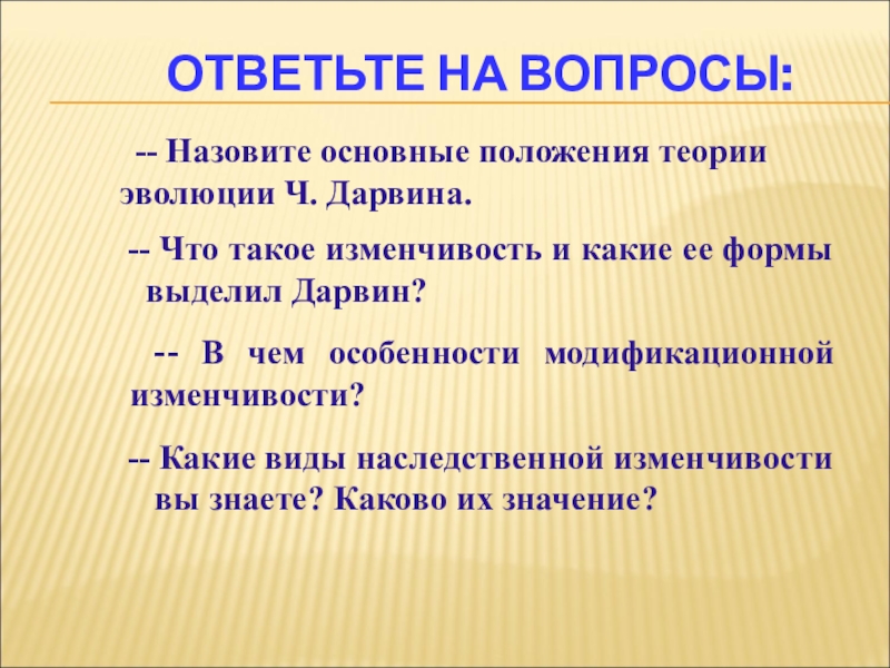 -- Назовите основные положения теории эволюции Ч. Дарвина.