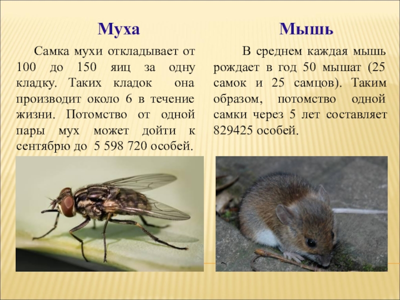 В среднем каждая мышь рождает в год 50 мышат (25 самок и 25 самцов). Таким образом, потомство одной самки через 5 лет составляет 829425 особей.