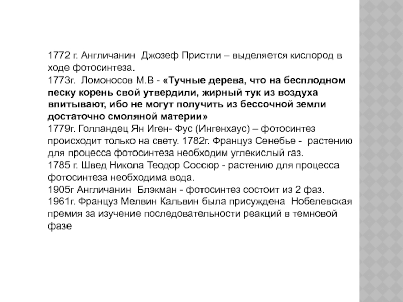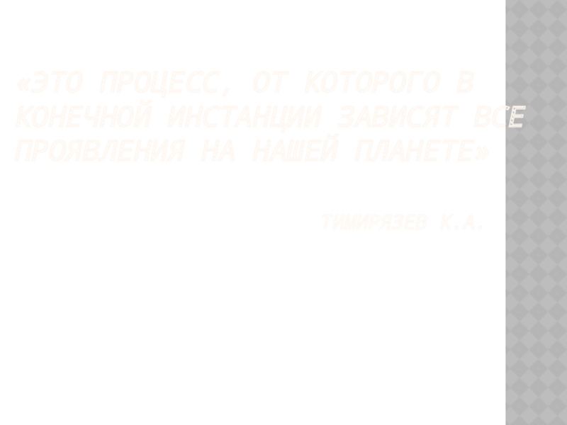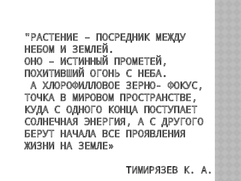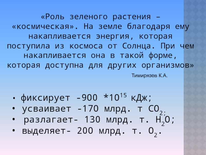 «Роль зеленого растения – «космическая». На земле благодаря ему накапливается энергия, которая поступила из космоса от Солнца. При чем накапливается она в такой форме, которая доступна для других организмов»