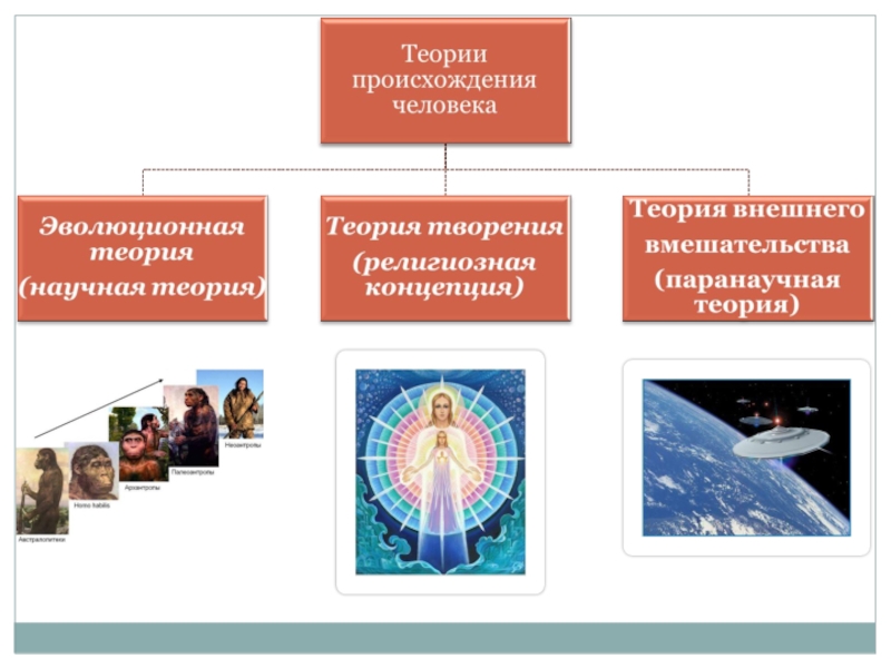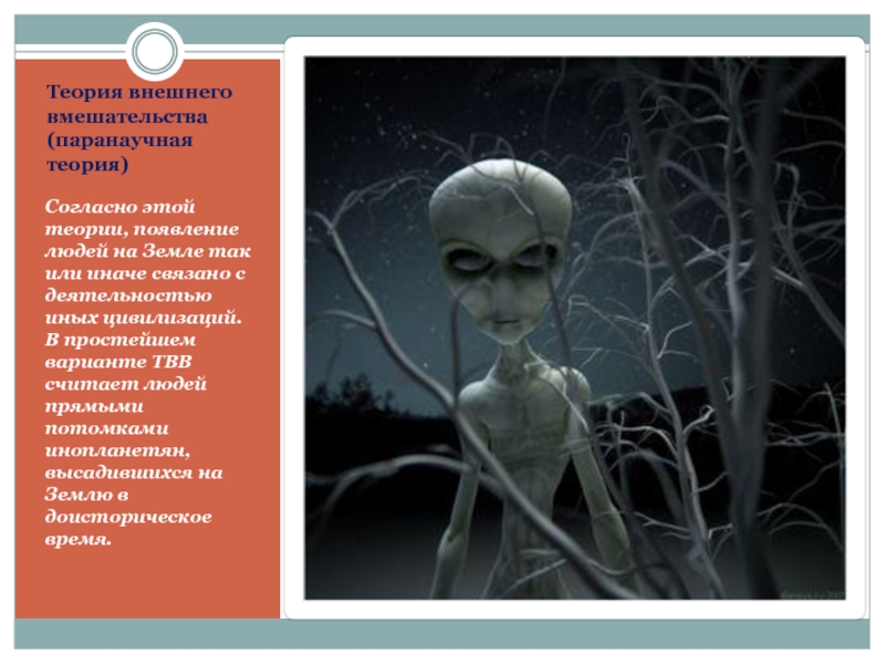 Теория внешнего вмешательства  (паранаучная теория) Согласно этой теории, появление людей на Земле так или иначе связано