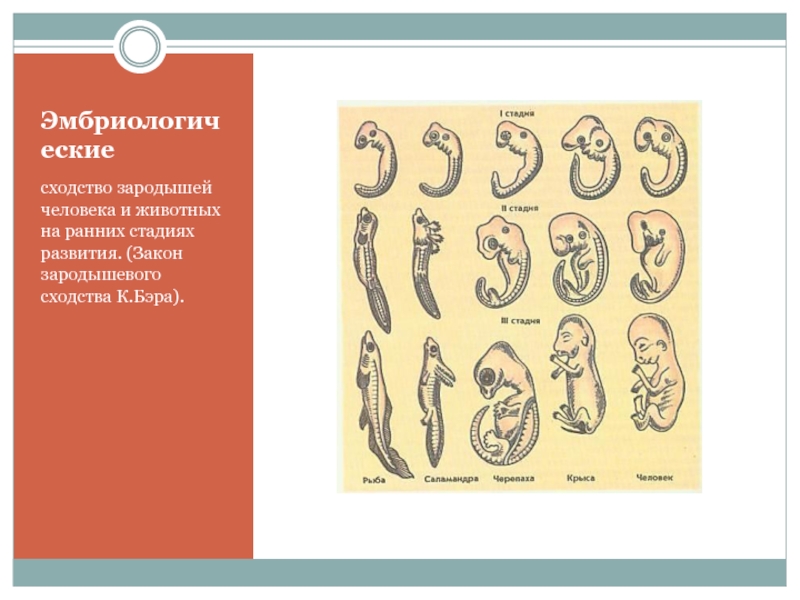 сходство зародышей человека и животных на ранних стадиях развития. (Закон зародышевого