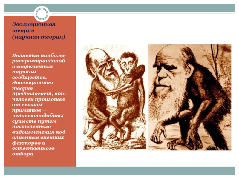 Эволюционная теория  (научная теория) Является наиболее распространённой в современном научном сообществе. Эволюционная теория предполагает, что человек