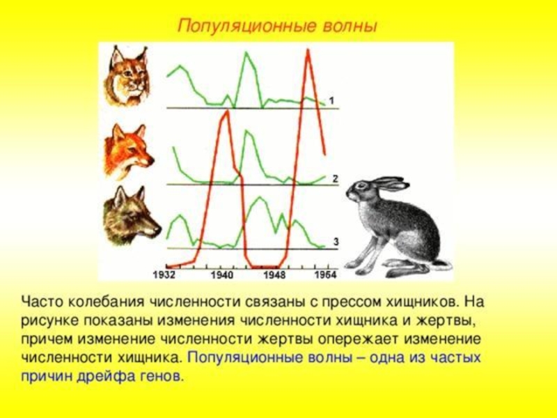 и пресс хищников, численность которых при обильном питании резко возрастает, и вспышки эпидемий, и природные катаклизмы. Например, при половодье или наводнении погибает большая часть популяции грызунов, генофонд ее при этом резко и случайно изменяется.