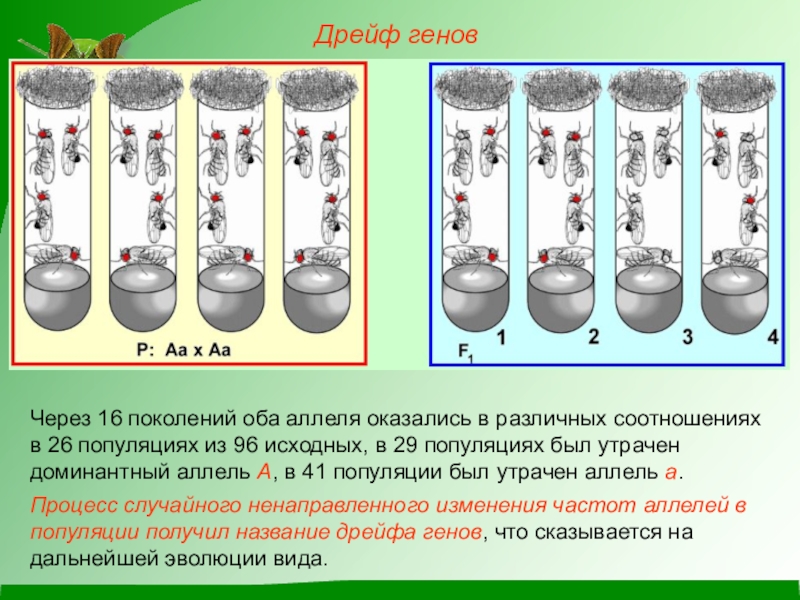 Слайд 21Через 16 поколений оба аллеля оказались в различных соотношениях в 26