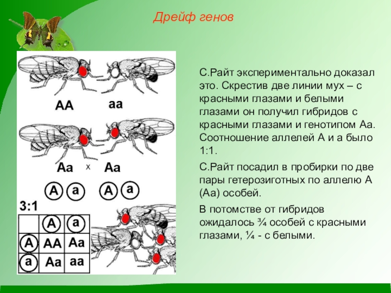 Слайд 20С.Райт экспериментально доказал это. Скрестив две линии мух – с красными