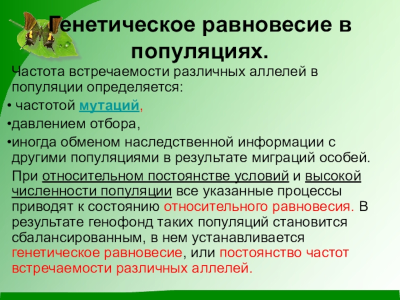 При относительном постоянстве условий и высокой численности популяции все указанные процессы приводят к состоянию относительного равновесия. В результате генофонд таких популяций становится сбалансированным, в нем устанавливается генетическое равновесие, или постоянство частот встречаемости различных аллелей.