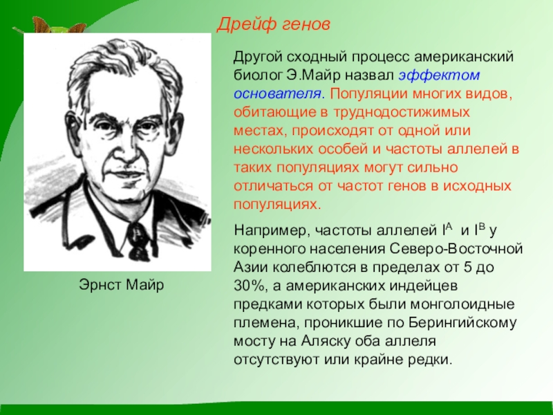Слайд 22Другой сходный процесс американский биолог Э.Майр назвал эффектом основателя. Популяции многих