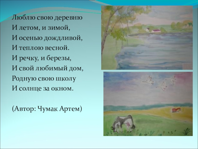 Люблю свою деревнюИ летом, и зимой,И осенью дождливой, И теплою весной.И речку, и березы,И свой любимый дом,Родную