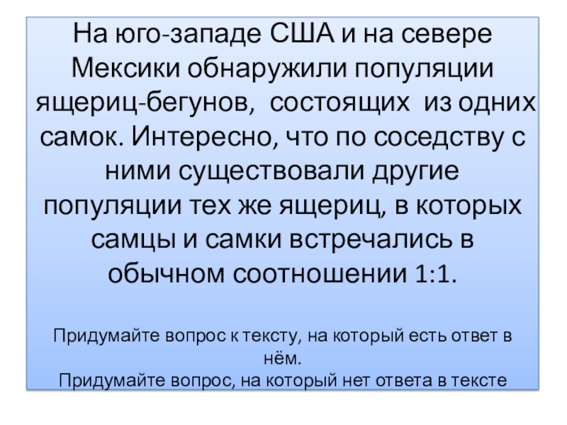 из одних самок. Интересно, что по соседству с ними существовали другие популяции тех же ящериц, в которых самцы и самки встречались в обычном соотношении 1:1. Придумайте вопрос к тексту, на который есть ответ в нём. Придумайте вопрос, на который нет ответа в тексте