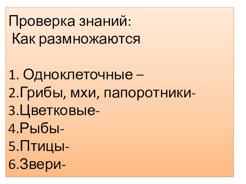 Слайд 8Проверка знаний: Как размножаются 1. Одноклеточные – 2.Грибы, мхи, папоротники- 3.Цветковые- 4.Рыбы- 5.Птицы- 6.Звери-