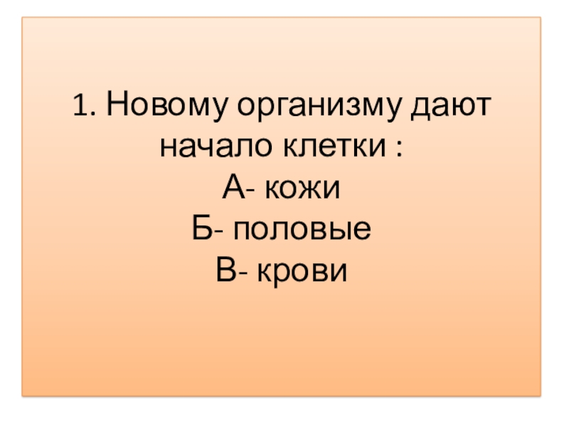 Слайд 11. Новому организму дают начало клетки : А- кожи Б- половые В- крови