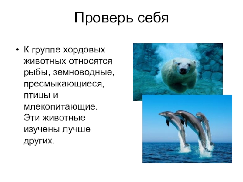 Проверь себяК группе хордовых животных относятся рыбы, земноводные, пресмыкающиеся, птицы и млекопитающие. Эти животные изучены лучше других.
