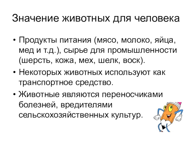 Значение животных для человекаПродукты питания (мясо, молоко, яйца, мед и т.д.), сырье для промышленности (шерсть, кожа, мех,
