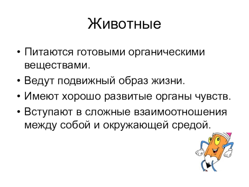 ЖивотныеПитаются готовыми органическими веществами.Ведут подвижный образ жизни.Имеют хорошо развитые органы чувств.Вступают в сложные взаимоотношения между собой и