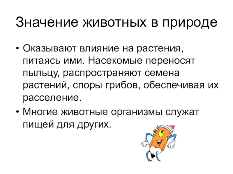 Значение животных в природеОказывают влияние на растения, питаясь ими. Насекомые переносят пыльцу, распространяют семена растений, споры грибов,