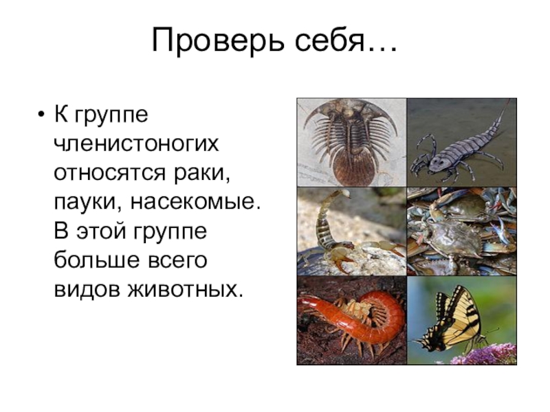 Проверь себя…К группе членистоногих относятся раки, пауки, насекомые. В этой группе больше всего видов животных.