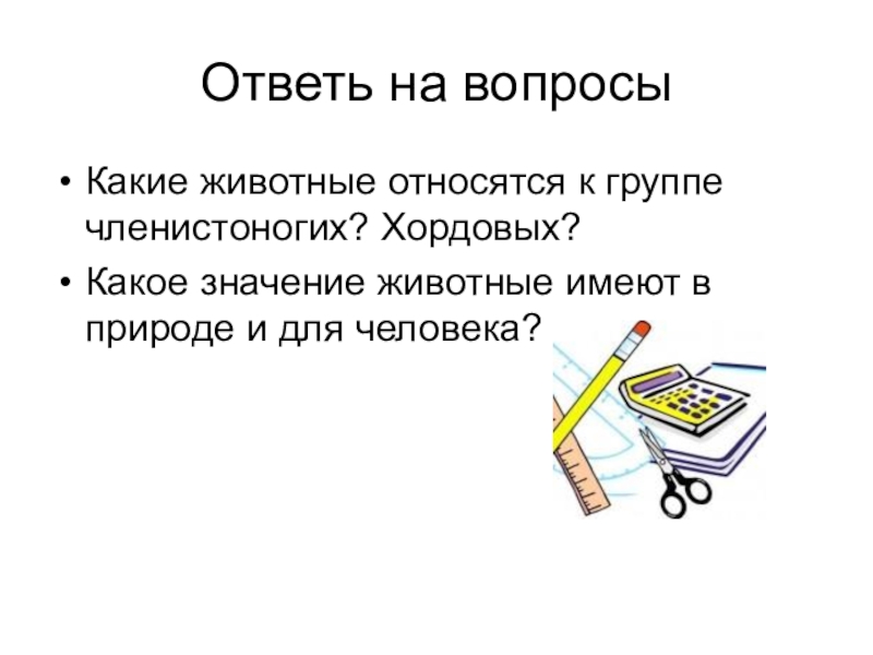 Ответь на вопросыКакие животные относятся к группе членистоногих? Хордовых?Какое значение животные имеют в природе и для человека?