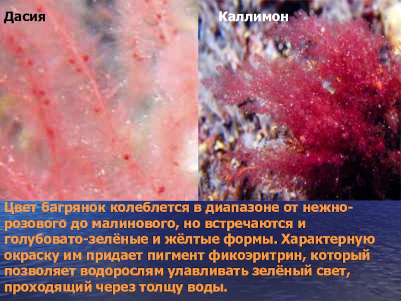 Цвет багрянок колеблется в диапазоне от нежно-розового до малинового, но встречаются и голубовато-зелёные и жёлтые формы. Характерную окраску им придает пигмент фикоэритрин, который позволяет водорослям улавливать зелёный свет, проходящий через толщу воды.