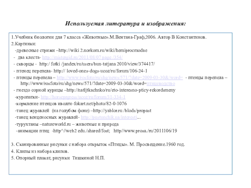 1.Учебник биологии для 7 класса «Животные».М.Вентана-Граф,2006. Автор В