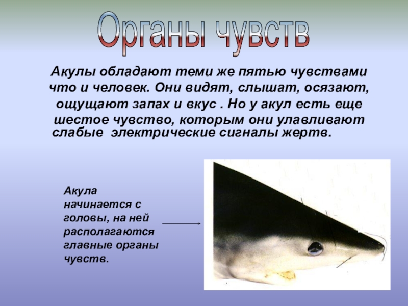 Акула начинается с головы, на ней располагаются главные органы чувств.