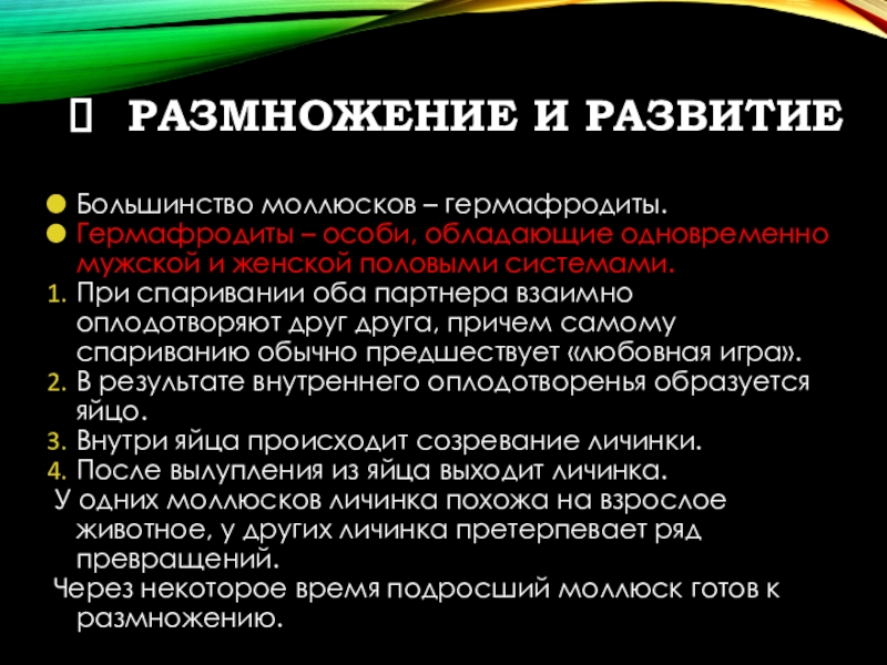 РАЗМНОЖЕНИЕ И РАЗВИТИЕБольшинство моллюсков – гермафродиты.Гермафродиты – особи, обладающие одновременно мужской и женской половыми системами.При спаривании оба