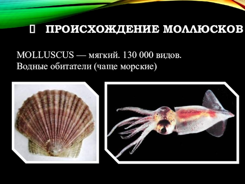 ПРОИСХОЖДЕНИЕ МОЛЛЮСКОВMOLLUSCUS — мягкий. 130 000 видов.Водные обитатели (чаще морские)