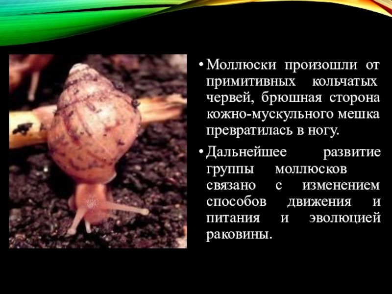Моллюски произошли от примитивных кольчатых червей, брюшная сторона кожно-мускульного мешка превратилась в ногу.Дальнейшее развитие группы 	моллюсков связано