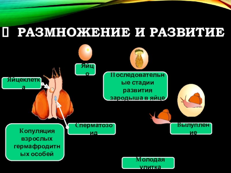 РАЗМНОЖЕНИЕ И РАЗВИТИЕКопуляция взрослых гермафродитных особейЯйцоПоследовательные стадии развития зародыша в яйцеВылуплениеМолодая улитка