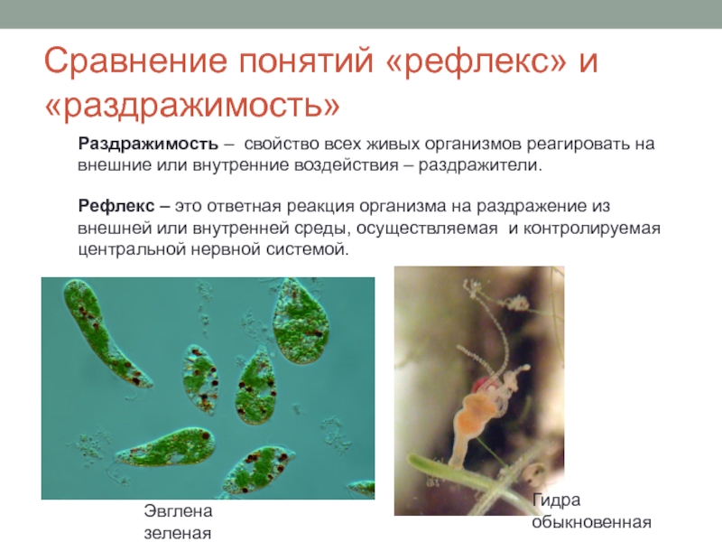 Раздражимость: сворачивание листьев у мимозы при прикосновении к ним; движение эвглены зеленой на освещенную сторону банки.