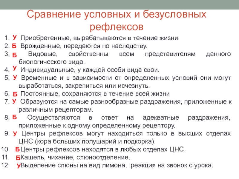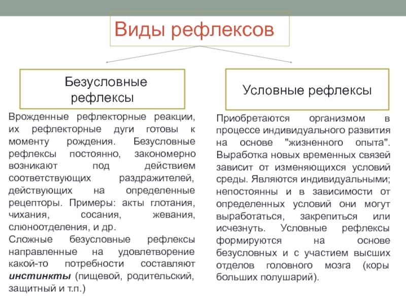 Приобретаются организмом в процессе индивидуального развития на основе "жизненного опыта". Выработка новых временных связей зависит от изменяющихся условий среды. Являются индивидуальными; непостоянны и в зависимости от определенных условий они могут выработаться, закрепиться или исчезнуть. Условные рефлексы формируются на основе безусловных и с участием высших отделов головного мозга (коры больших полушарий).