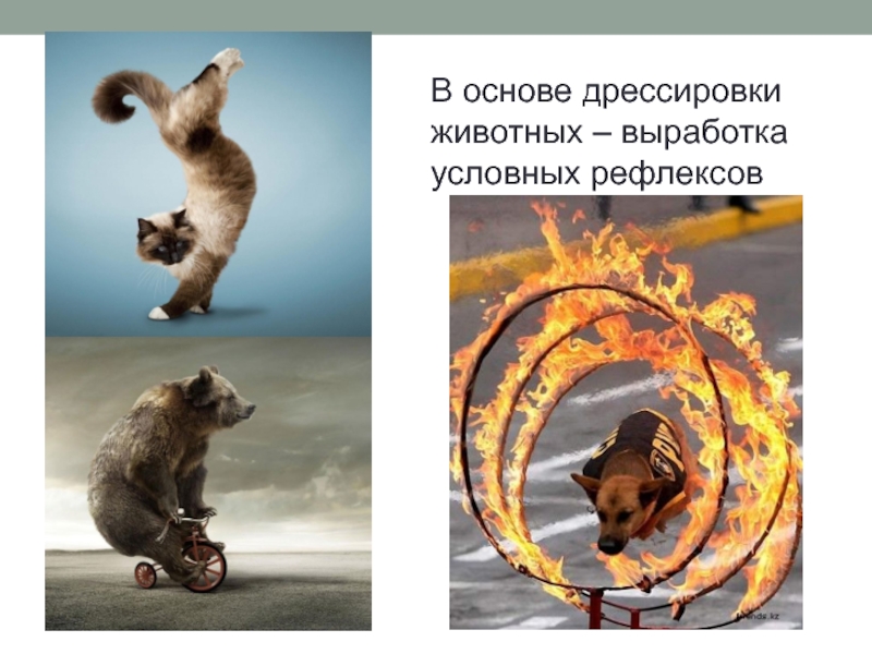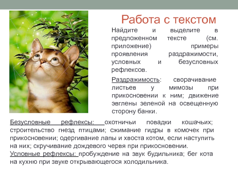 Безусловные рефлексы: охотничьи повадки кошачьих; строительство гнезд птицами; сжимание гидры в комочек при прикосновении; одергивание лапы и хвоста котом, если наступить на них; скручивание дождевого червя при прикосновении.