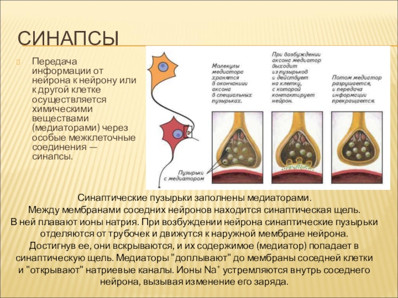 синаптическую щель. Медиаторы "доплывают" до мембраны соседней клетки