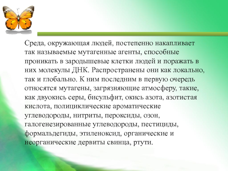 Слайд 24Среда, окружающая людей, постепенно накапливает так называемые мутагенные агенты, способные проникать