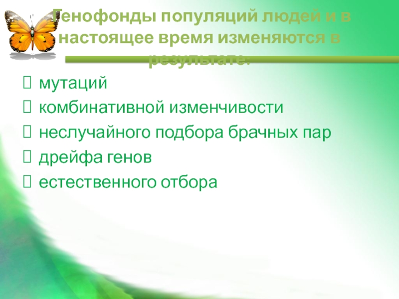 Слайд 6 Генофонды популяций людей и в настоящее время изменяются в результате: