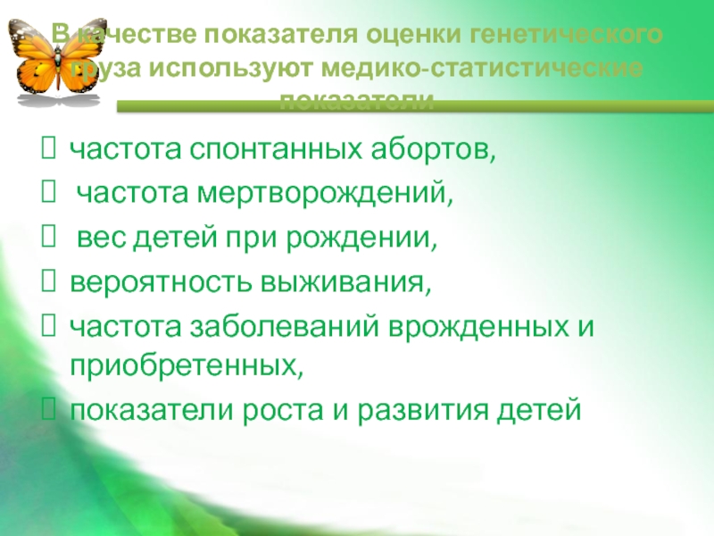 Слайд 23В качестве показателя оценки генетического груза используют медико-статистические показатели